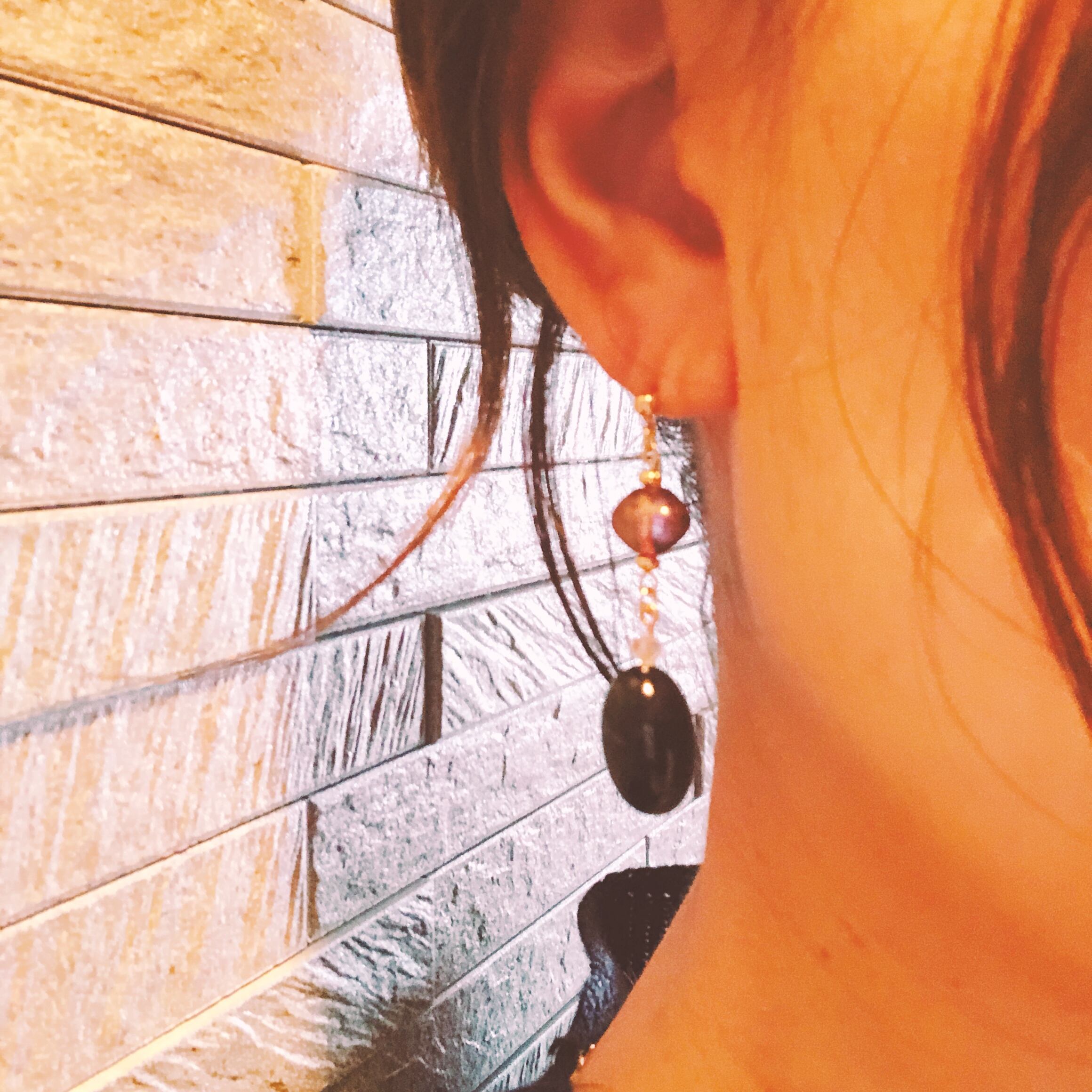 パープルの天然石とストーン風ビーズ、さらにスワロフスキーを使用した落ち着いたピアスです。