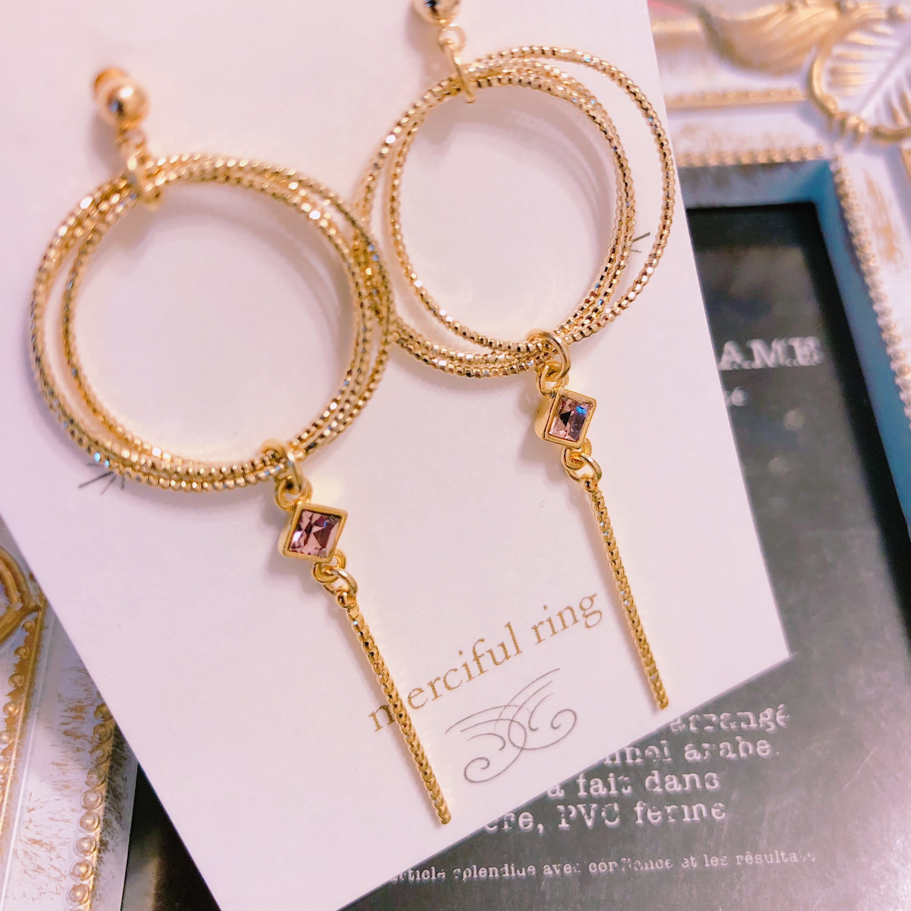 三連メタルリングがキラキラ。 スワロフスキーをあしらった大人可愛いピアス。